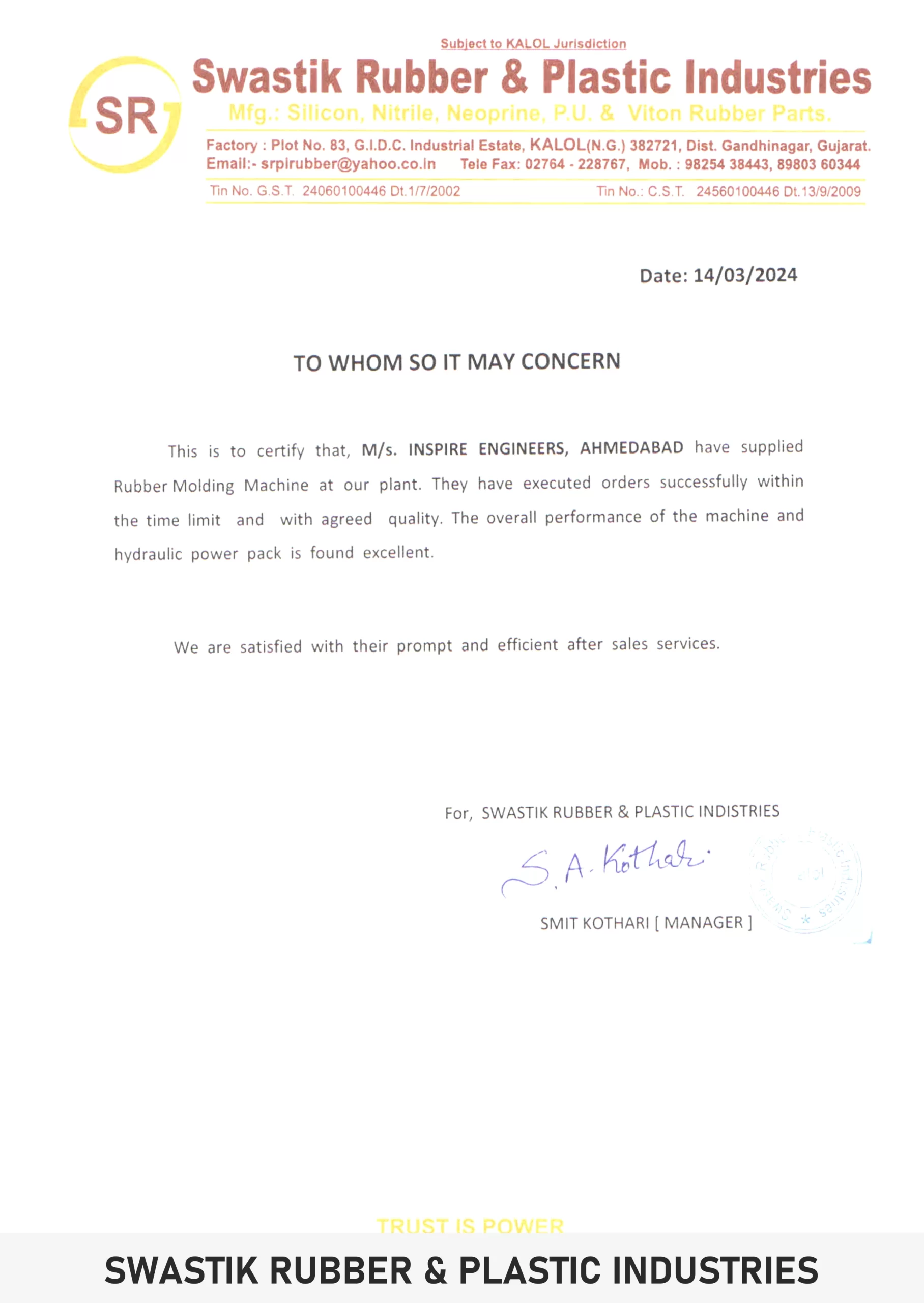 - Swastik Rubber & Plastic Industries in Kalol, Gujarat is a manufacturer of various rubber and plastic products. They specialize in natural rubber seals, extruded rubber, and other rubber-related items.